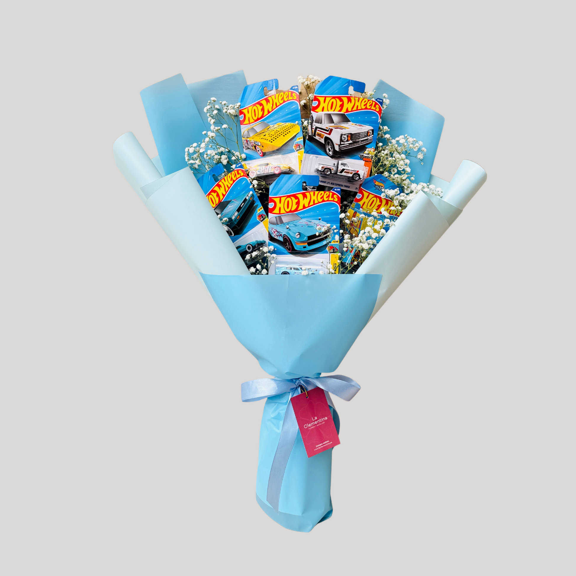Un regalo original para ellos. Nuestro ramo de carritos Hot Wheels sorprende y alegra, porque ellos también merecen ser engreídos. Contiene 5 carritos en modelos variados (no se puede elegir modelo, es surtido), envueltos en papeles decorativos modernos que convierten este detalle en algo inolvidable.