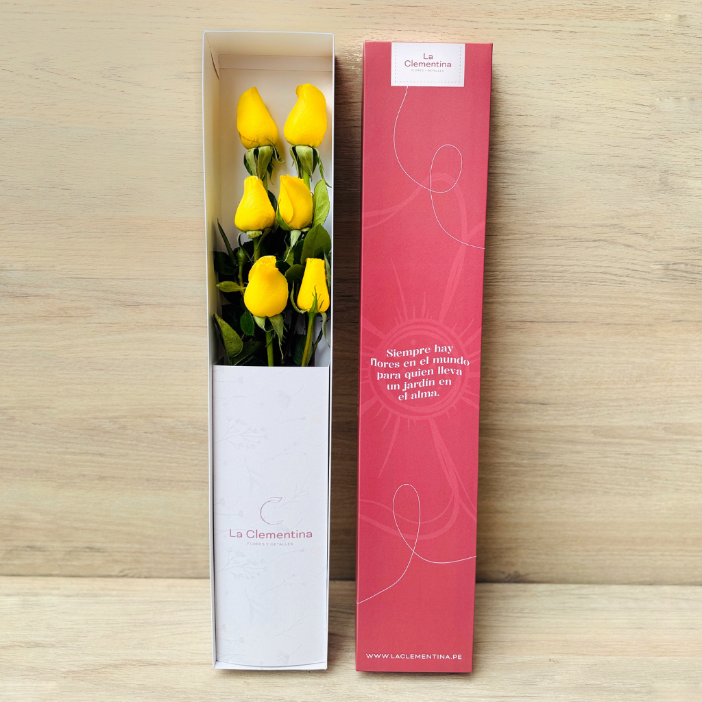 Nuestras cajas nunca pasan de moda y combinan con todos los motivos: pareja, amistad y amor propio. Esta caja contiene 6 rosas en nuestra emblemática caja Clementina.