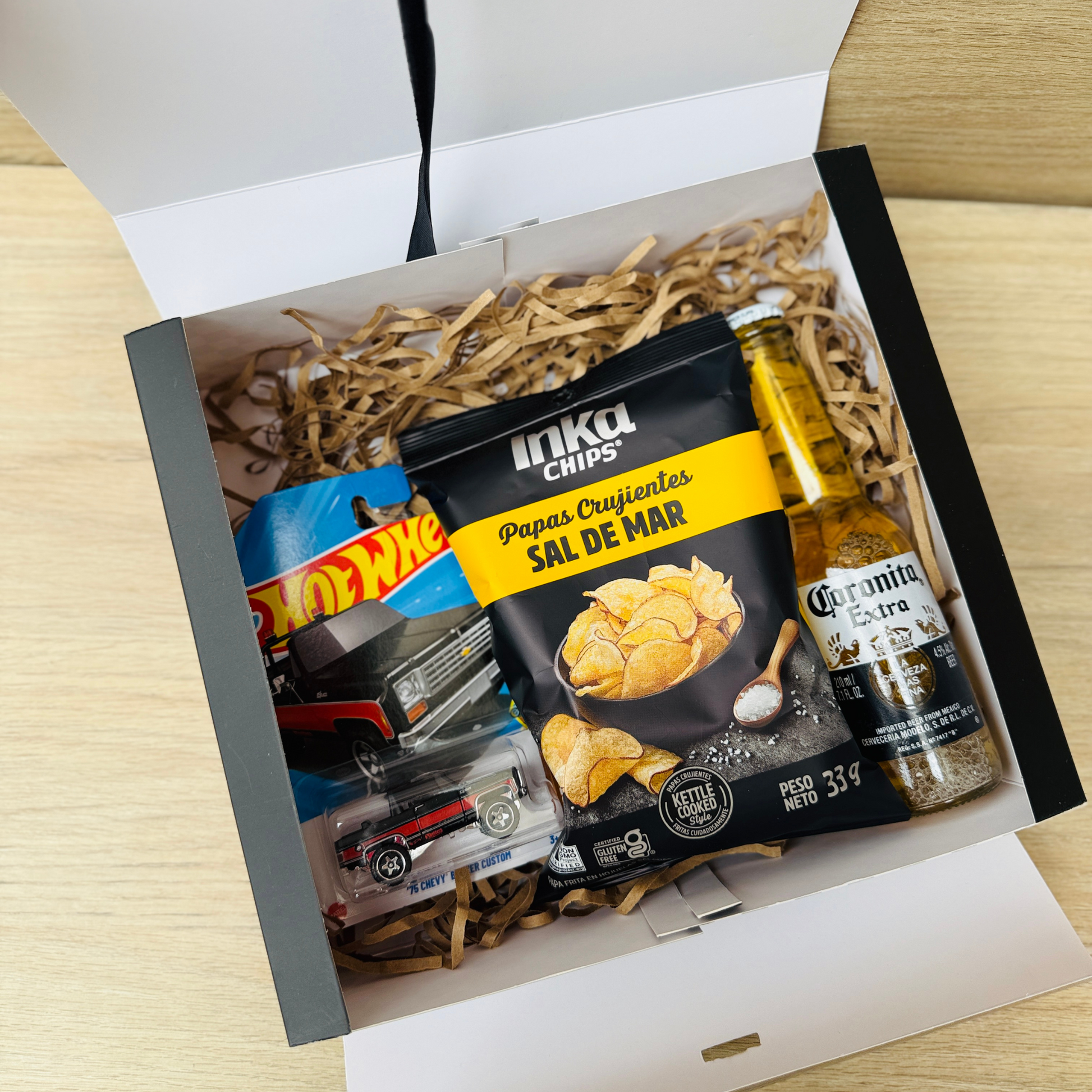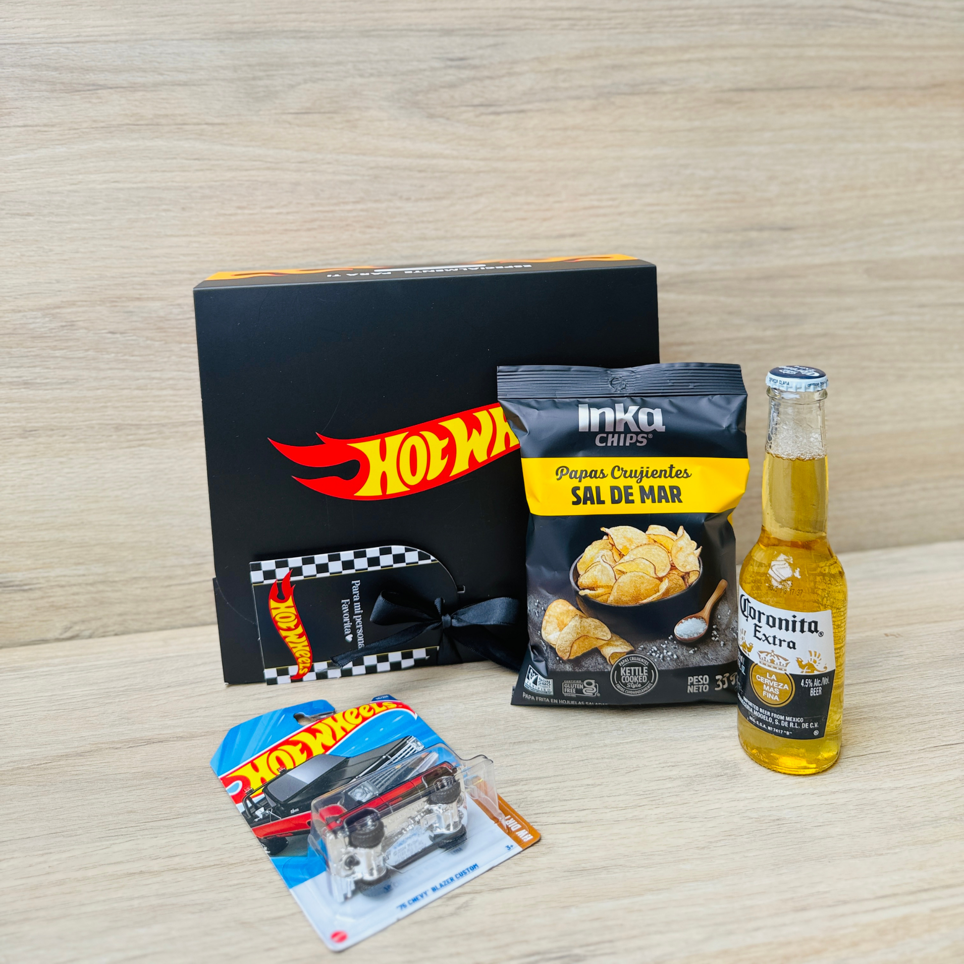 Una cajita divertida y diferente para sorprender a ese chico especial. Contiene 1 carrito Hot Wheels, unas papitas y una cerveza para acompañar la celebración. Un detalle lleno de ternura que mezcla juego, sabor y alegría en un solo regalo.