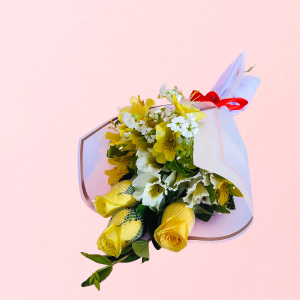 Ramo 3 rosas amarillas y flores variadas.