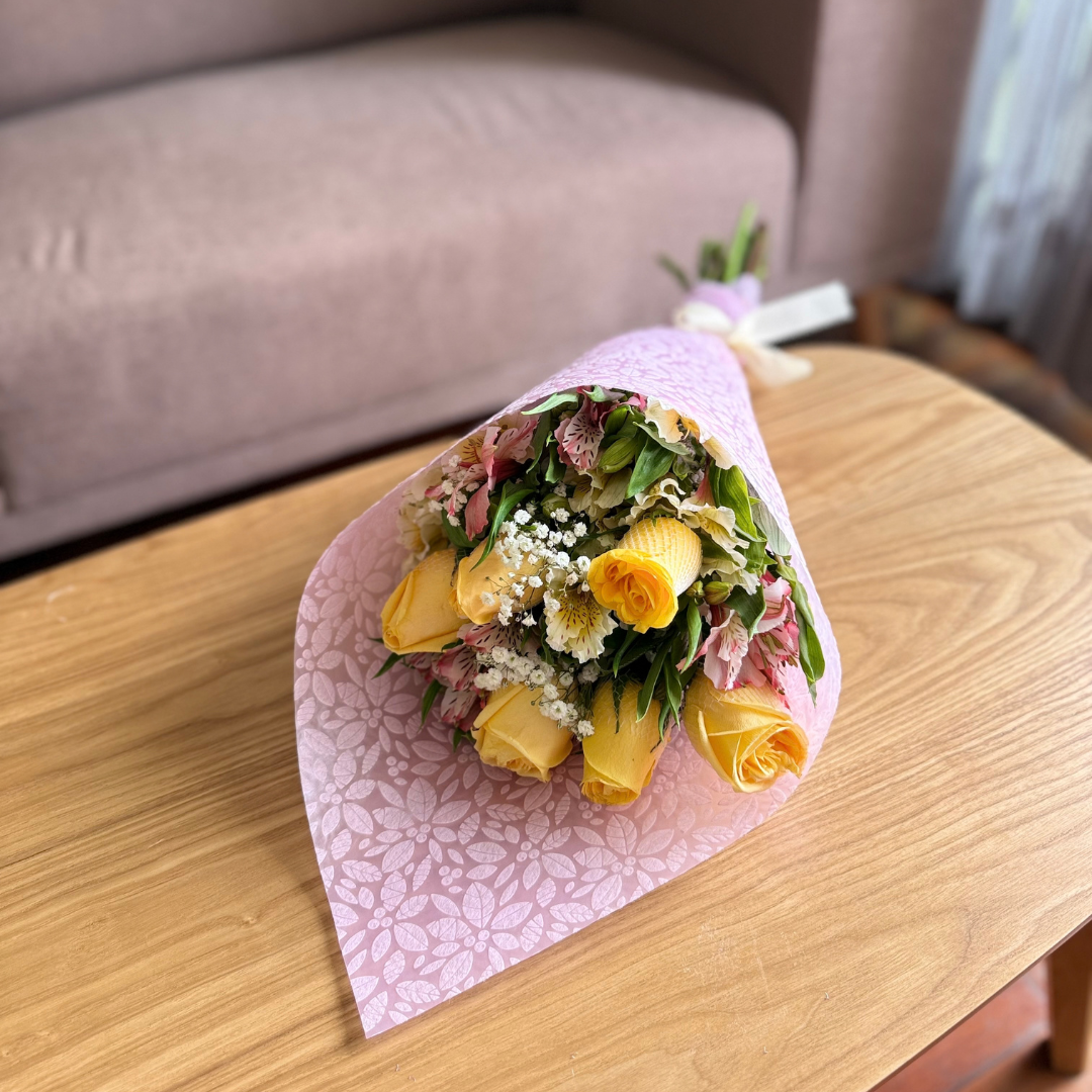 Nuestro ramo clásico contiene 6 rosas frescas acompañadas de follajes variados, envueltas en tela decorativa / Notex que realza su estilo sencillo y elegante. Un detalle especial, ideal para expresar amor y gratitud en una fecha tan significativa.