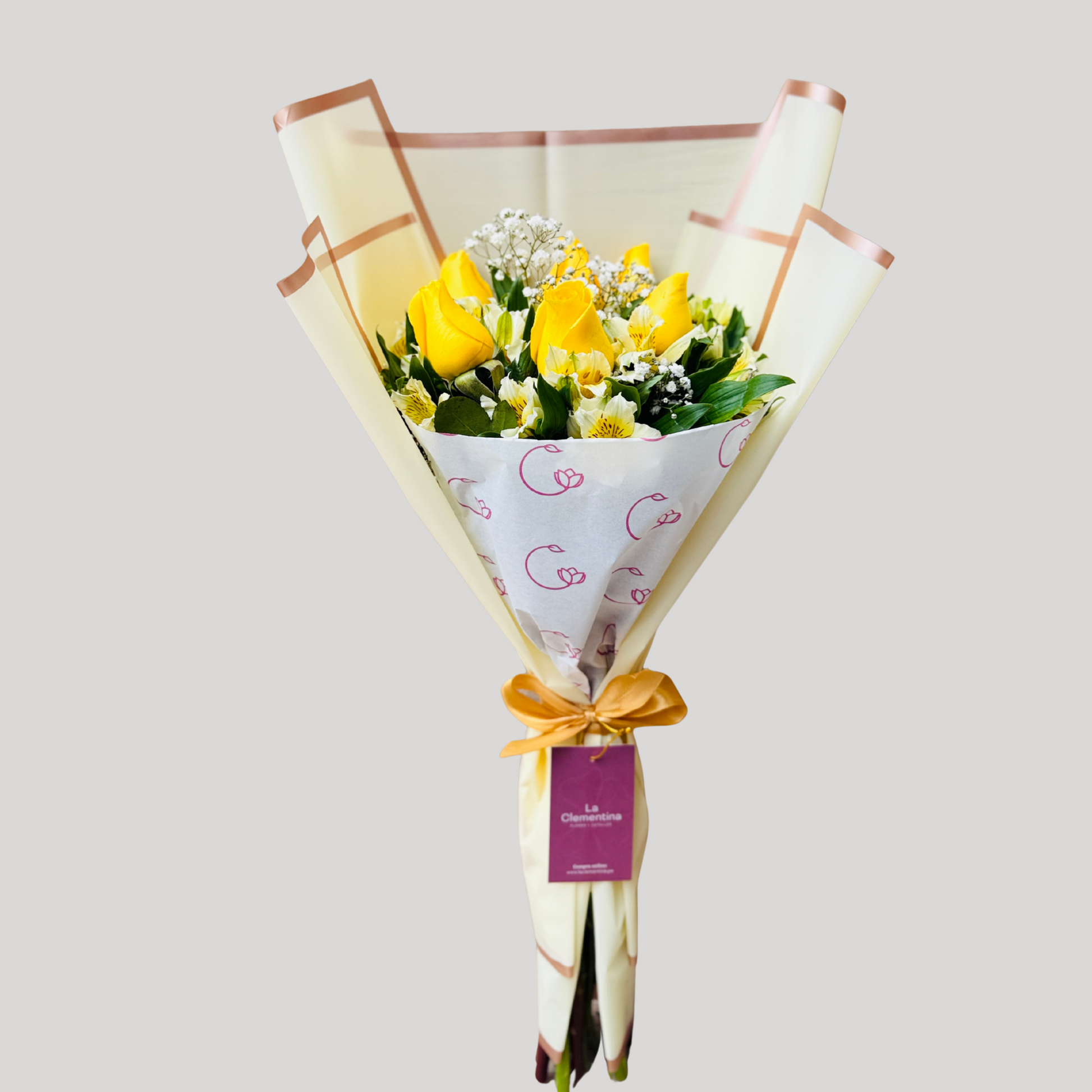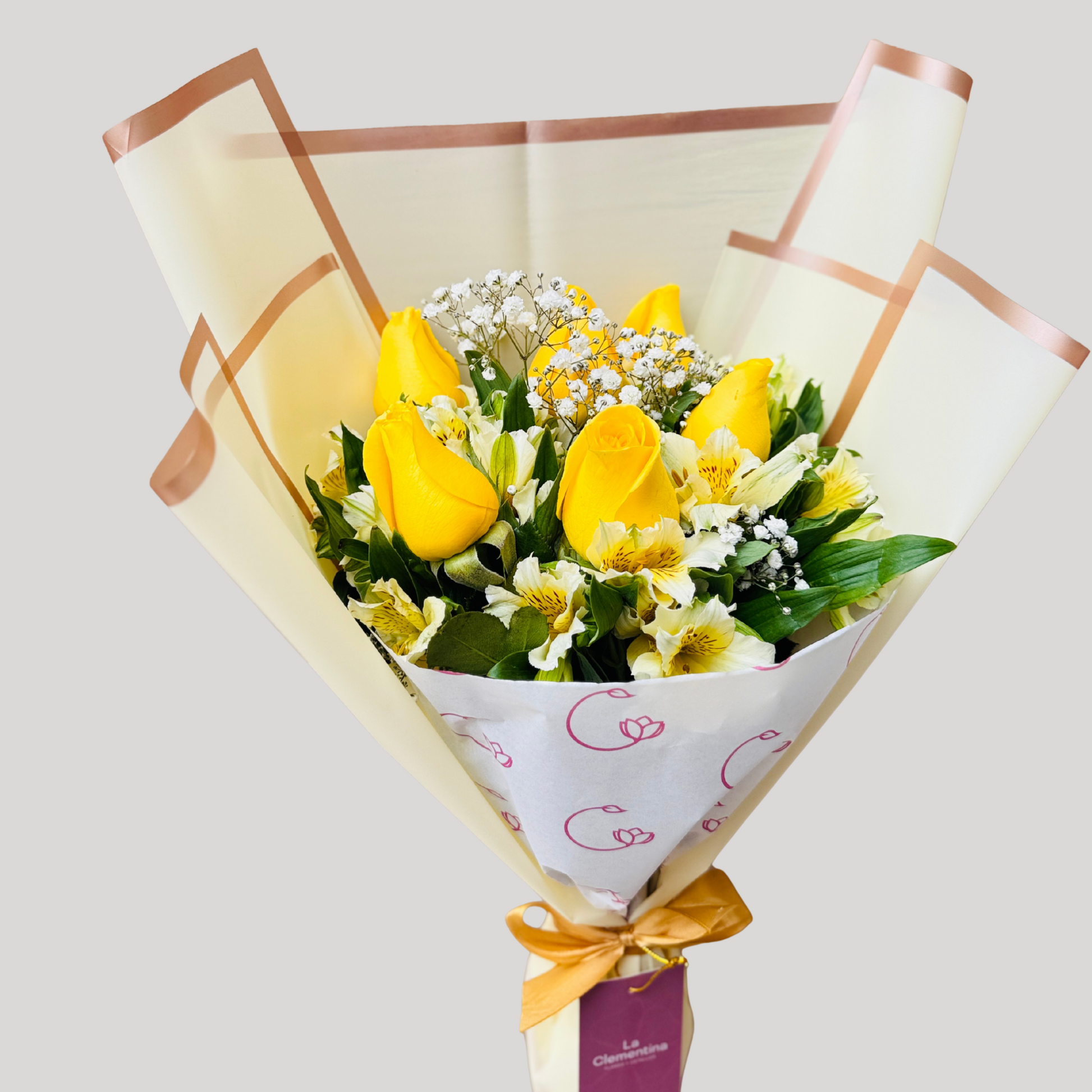 Un ramo lleno de simbolismo y alegría. Contiene 6 rosas amarillas, astromelias y follajes frescos, todo envuelto en papeles decorativos de tendencia. Es el regalo perfecto para transmitir cariño, amistad y amor en su forma más luminosa.